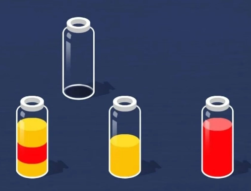 玩法很简单,点击任意瓶子就能移动它,把最上方瓶子里的液体倒进空瓶,或者倒进装着对应颜色液体的瓶子里。