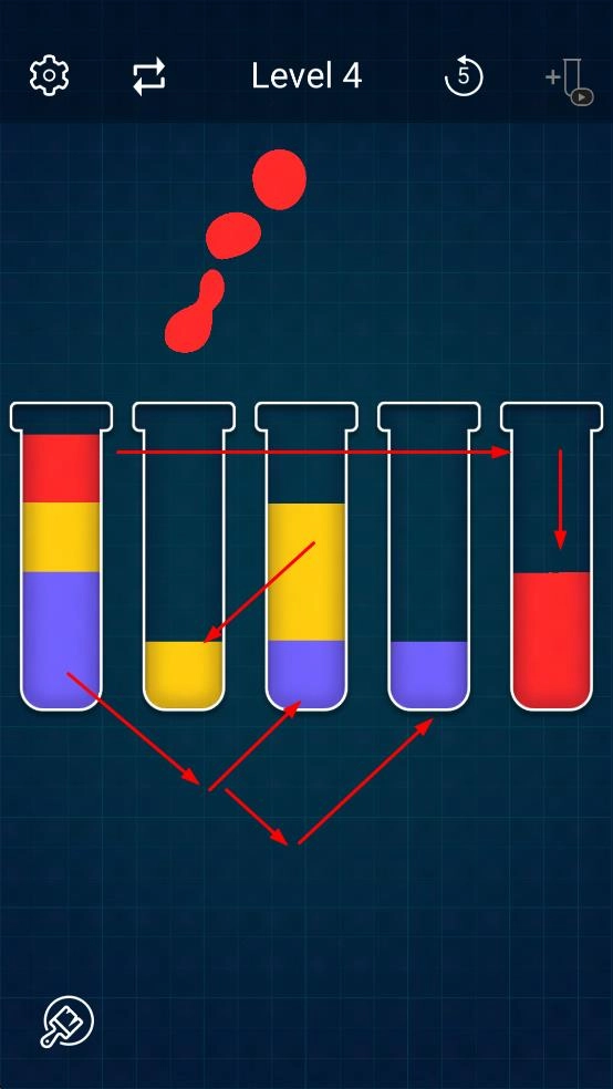 小心进行液体转移操作:玩家轻点任意一个玻璃杯,液体便会倒入另一个玻璃杯中。在此过程中务必格外谨慎,防止不同颜色的液体混杂在一起。每一次倾倒都要提前规划好路径,保证各种颜色的液体能够有序分离。