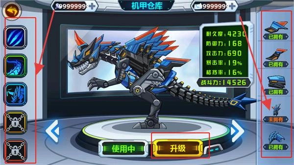 机甲仓库里,你可以用左侧的技能和右侧的部件来搭配出属于自己的战机甲。点击【升级】按钮能够提升机甲的属性,比如耐久和攻击,还能解锁那些“未拥有”的部件,从而进一步增强机甲的战力。