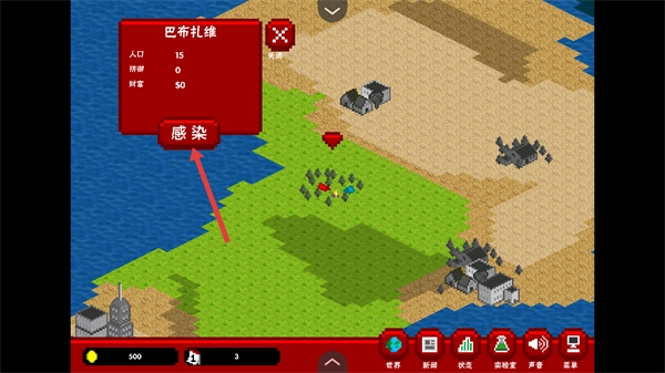 在区域界面(例如巴布札维)点击【感染】按钮进入关卡,查看该区域的人口数量、控制率等相关数据,为接下来展开感染行动做好准备。