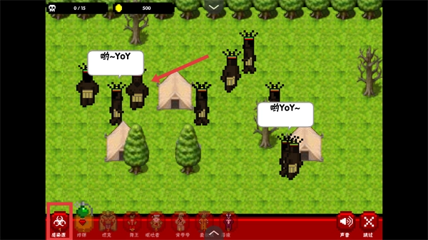 进入关卡后,选中方框内的【感染源】,把它放置到箭头指示的人群中,释放病毒以实现感染。