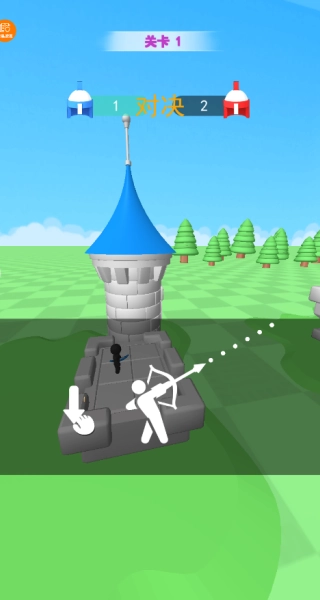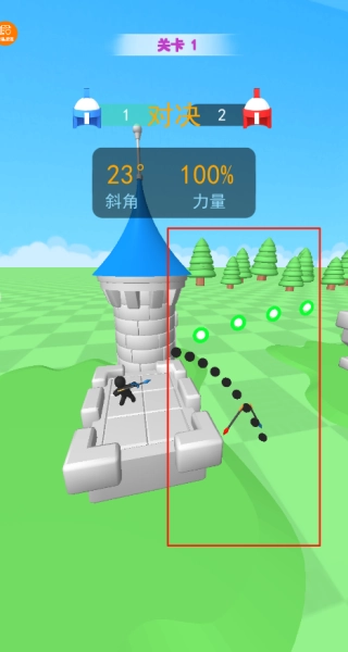 基本玩法是操控自己的角色与对手角色展开对决,通过点击屏幕来调整武器的角度和力度。