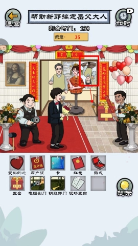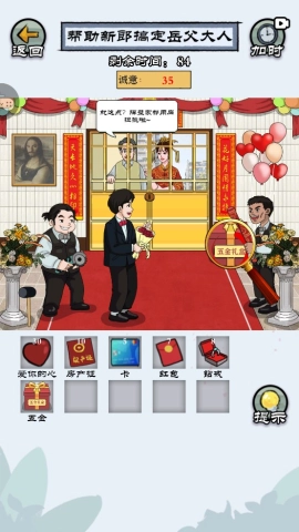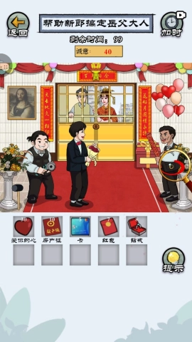 拖动放大镜到新郎身上,查找房产证、银行卡以及那颗“爱你的心”。