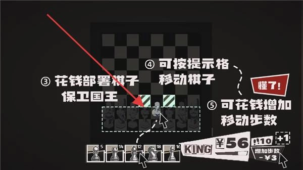 实战玩法教学涵盖了“消耗金币部署棋子守护国王”“依照提示格子移动棋子”“花费货币增加移动步数”等策略,为游戏操作提供指导。
