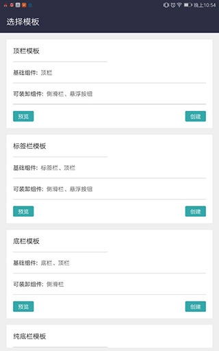 可分为顶栏模板、标签栏模板、底栏模板、纯底栏模板和空白模板几种类型。大家可以根据自身需求来选择,这里我们选用顶栏模板。接着输入应用名称,然后点击创建按钮即可。