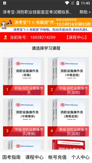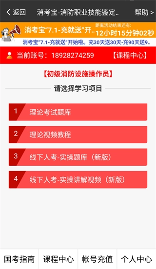 打开消考宝正版App,能看到包含国考指南、课程中心、帐号充值、个人中心在内的四大板块,点击你想要学习的内容即可。