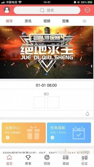 芒果电竞是一款专注于电竞资讯的应用,其功能模块涵盖首页、赛事、预测、商城与社区等部分。