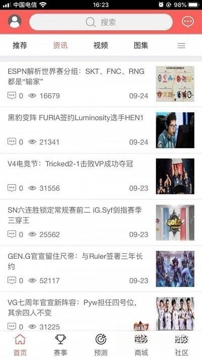 首页主要展示电竞赛事报道、圈内资讯以及相关视频;