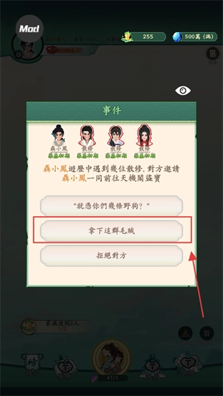 当遇到散修邀约一同盗取宝物时,若选择【拿下这群毛贼】便会触发战斗,要是自身实力不够就会战败,所以得谨慎选择。