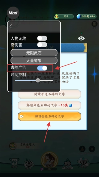 开启【去除广告】功能以避免干扰,解读【金色石碑】上的文字来学习新功法,从而提升角色能力。