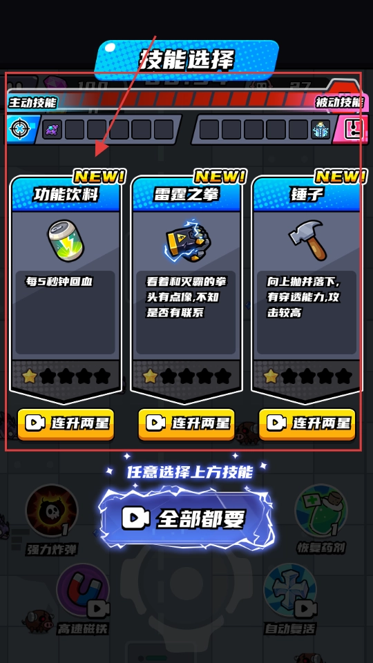 4、技能选择阶段,可挑选“功能饮料”“雷霆之拳”等技能,或选“全部都要”获取更多能力。