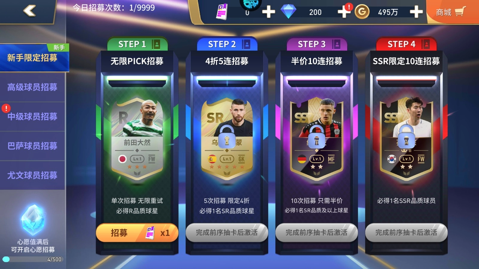 各位刚进入游戏的经理人可以跟着新手引导完成群星闪耀第1章的剧情,这样就能拿到R拉姆塞。之后每通过一章群星闪耀,都能获得一名球员,所以咱们得尽快推进主线剧情,好获取更多球员。等第六章主线全部3星通关后,就能得到SR边锋马内;而世界挑战赛1-10白俄罗斯关卡完美通关的话,还能获取SR后卫J博阿滕。