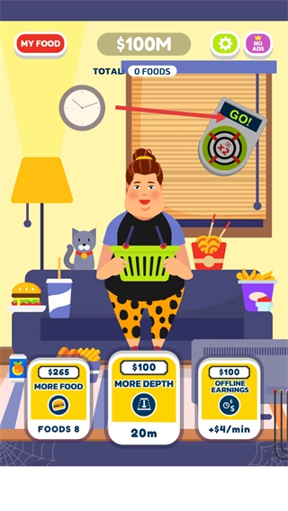 点击红色箭头所指的【GO!】按钮,就能进入游戏,开启收集垃圾食品的环节。