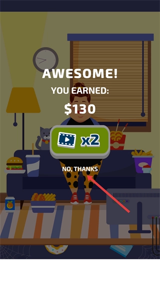 游戏结束后,点击【NO,THANKS】,即可结束当前游戏并查看收益情况。