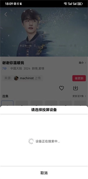 回到软件的剧集播放界面后,再次点击【tv】按钮就能启动投屏功能,待搜索到可用的投屏设备,即可完成投屏连接。