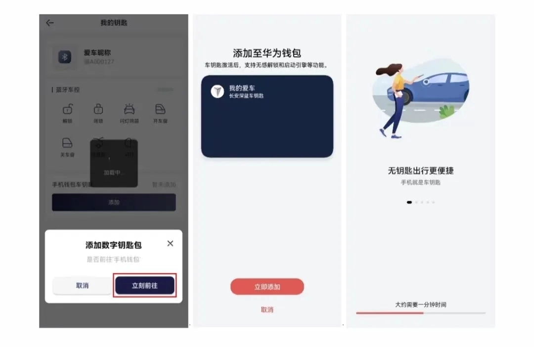 用户可先在手机上安装深蓝App并打开,随后靠近车辆(10米范围内)。进入App的服务板块,找到数字钥匙功能并点击当前车辆,接着选择添加选项。此时App界面会弹出“添加数字钥匙包”的提示,点击“立刻前往”后将跳转至华为钱包,在钱包页面点击“立即添加”,等待约一分钟完成钱包钥匙的开通。开卡成功后,手动进行蓝牙配对操作,当钱包页面显示“蓝牙已连接”时,即表示数字钥匙开卡流程全部完成。