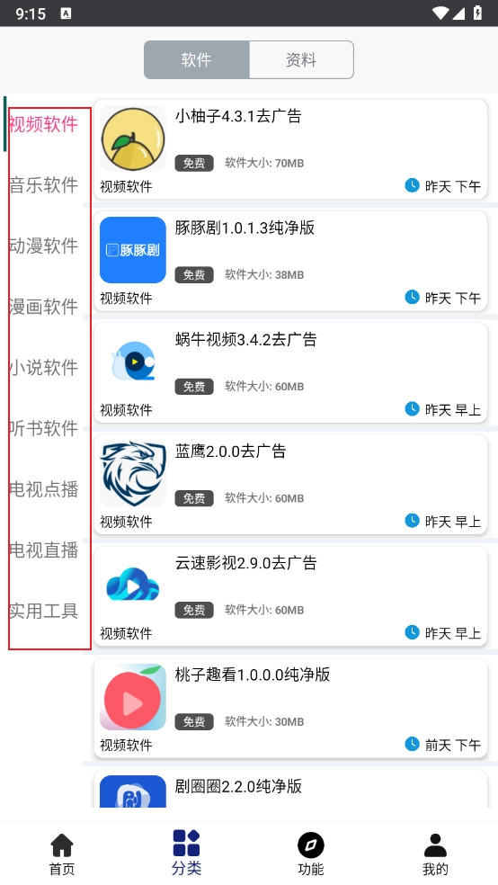 进入“分类”板块,这里有各类视频、小说、电视节目以及实时工具等多种内容可供你挑选。