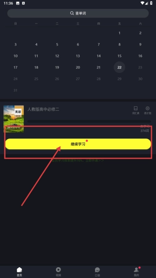 1. 启动英语学习应用程序,轻点“继续学习”按钮,跳转至课程学习界面,开始英语知识的学习。