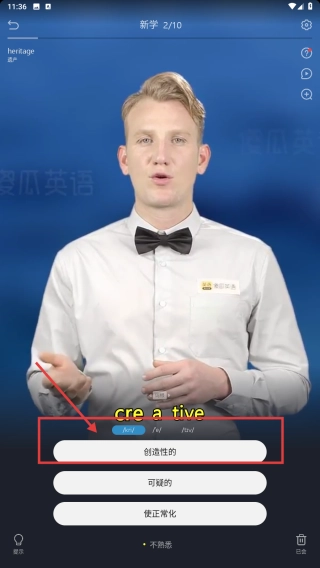 2、在课程答题环节,根据视频内容选择creative的正确释义,完成知识巩固练习。