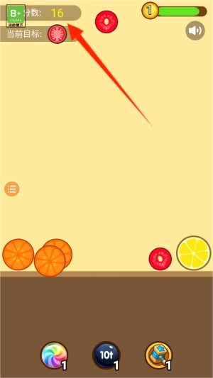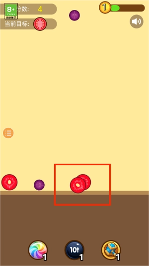 2、通过点击选中目标水果,使其自然坠落到下方放置区域。