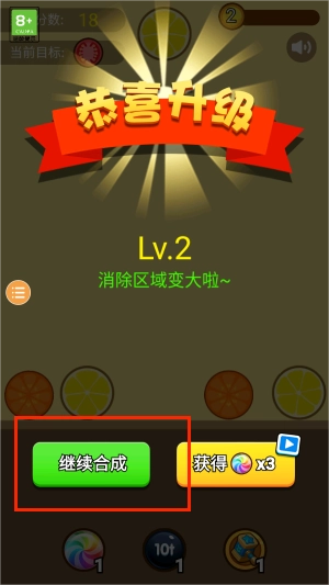 1、在游戏场内,通过触控滑动的操作方式来移动水果,当两个相同品类的水果相互接触时,便会自动合成为更高级的水果。若出现连锁合成的情况,还会触发额外的分数奖励。