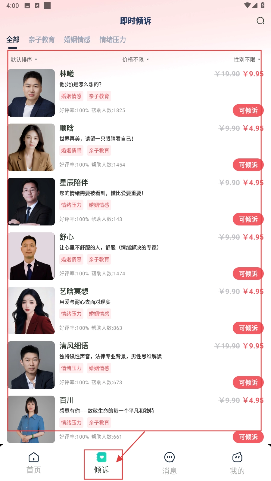 切换至【倾诉】界面,点击倾听师列表,启动倾诉流程操作。