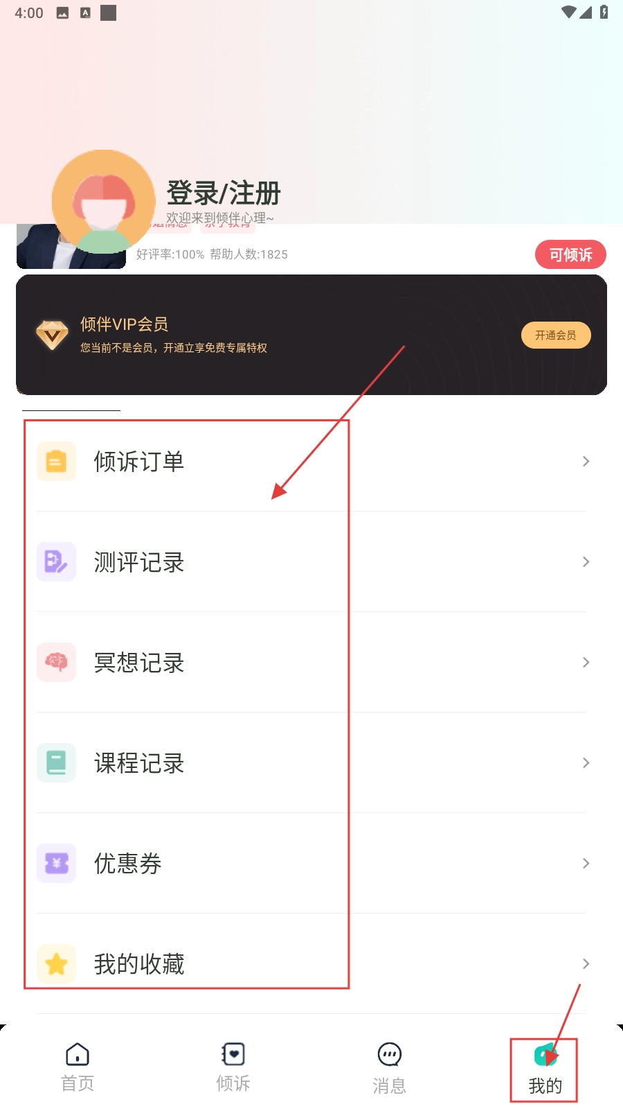 打开应用后,在首页找到并点击倾诉专区,即可进入心理服务的选择操作环节。