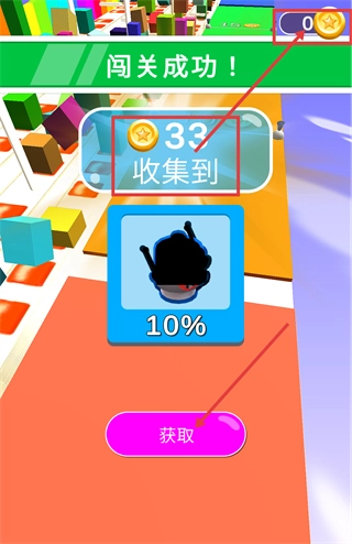 完成【闯关成功】后,核实已收集到【33-金币】,点击【获取】来领取奖励,并且解锁物品的【10%-进度】。