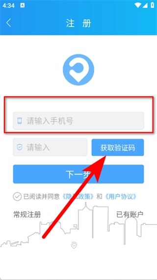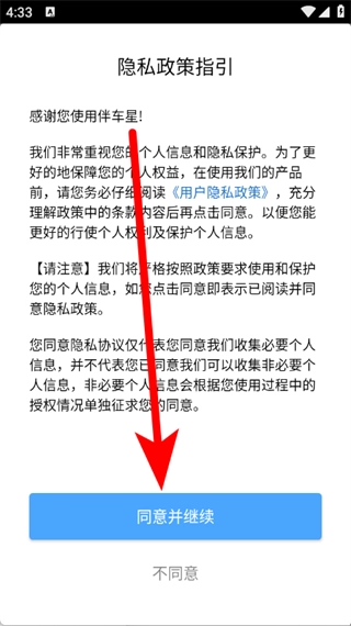 打开伴车星应用后,当出现隐私政策指引的弹窗时,点击“同意并继续”按钮。