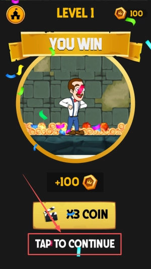 通关领奖:画面显示“YOUWIN”与“+100X3COIN”时,点击“TAPTOCONTINUE”即可领取奖励并进入下一关。