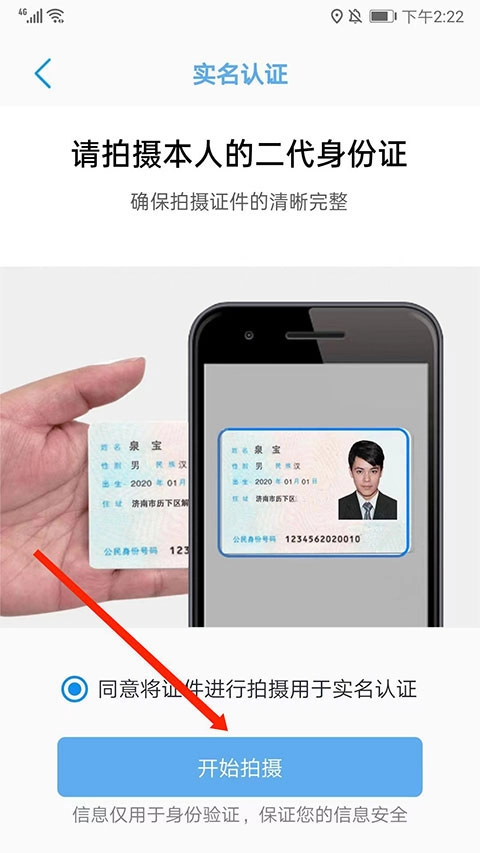进入实名认证的界面,勾选“同意”选项后,再选择下方的“开始拍摄”按钮。