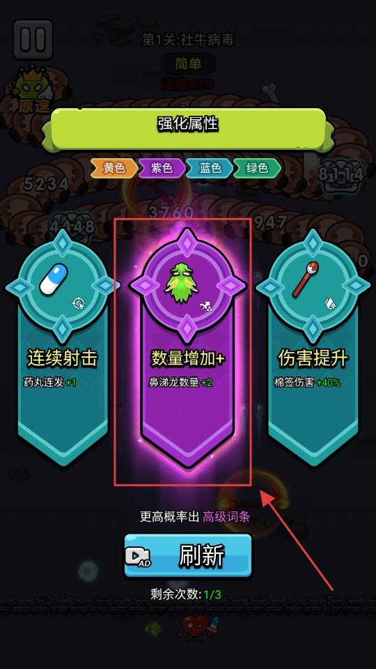 强化时选择【数量增加+】,能让鼻涕龙的数量增加2只,这样可以提升它们的攻击频率和范围,从而增强清场能力。
