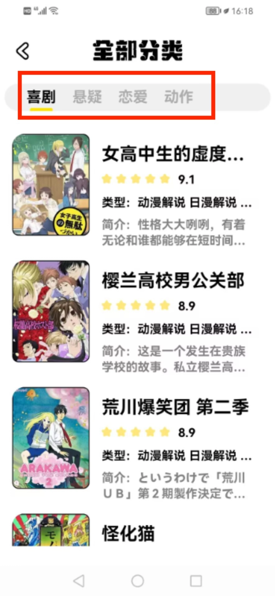 打开应用后进入分类总览页面,点击喜剧标签查看相关动画作品。