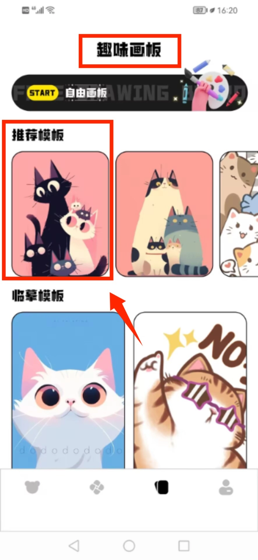 切换到趣味画板功能区域,从推荐图库里面挑选自己喜欢的猫咪样式模板。