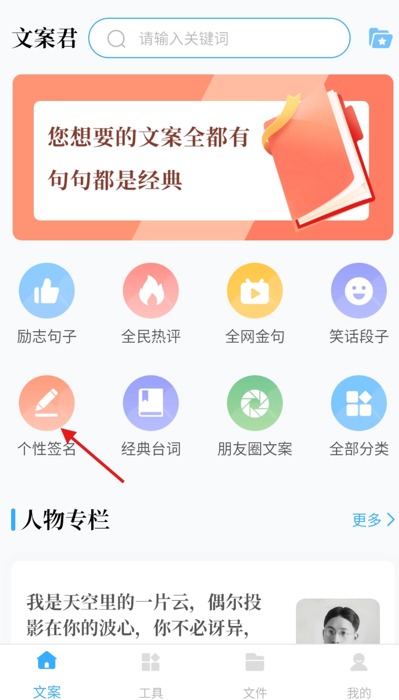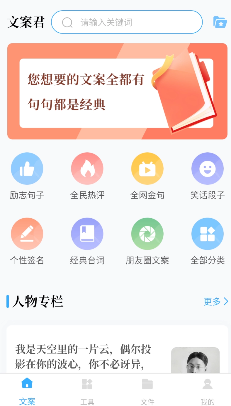 安装获取:打开手机应用商店,搜索“文案君”完成安装,随后点击图标进入软件主界面。