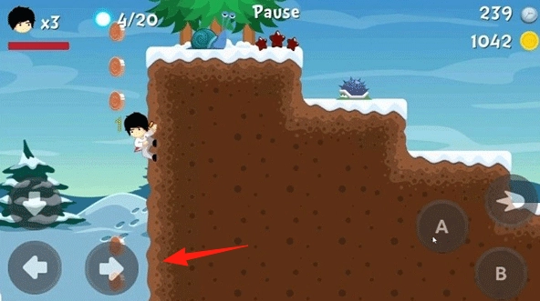 操控黑发角色(红箭头标识),在雪地场景中,通过左右方向键控制移动,攀爬土坡,避开蜗牛与刺猬,收集金币(当前4枚,目标20枚以上)。