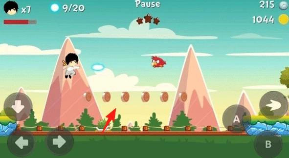 进入山地关卡(红箭头指示处),按下A键执行跳跃动作,穿过火圈,避开飞鸟的攻击,收集关卡内的道具(当前进度9/20),以此推动地图进度。