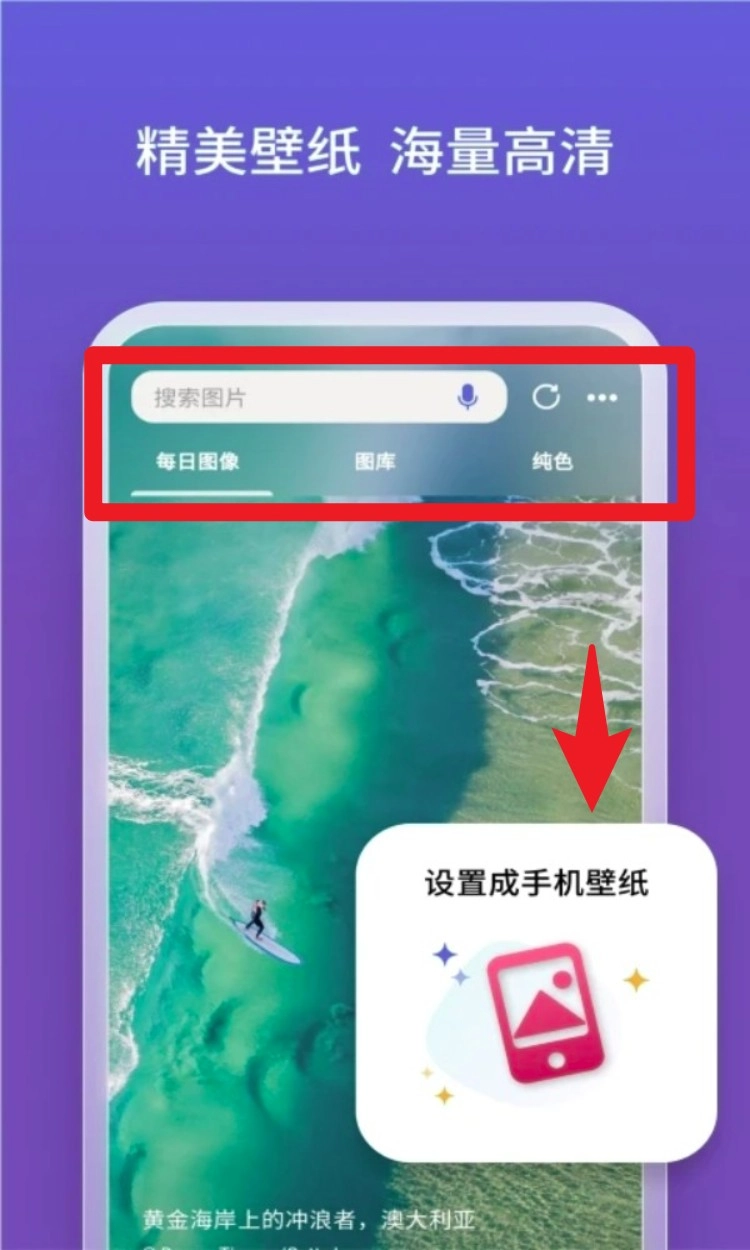 切换到壁纸功能页面,输入关键词搜索图片,浏览后能一键设为手机壁纸,操作简单明了。