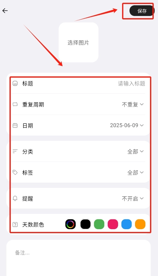 请先输入标题、是否重复、日期、分类、标签、提醒以及天数颜色等具体信息,然后点击右上角的保存按钮即可。
