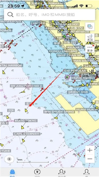船舶搜索支持通过船名、呼号、IMO编号或MMSI码查找船舶,查询结果能迅速在海图上完成定位。