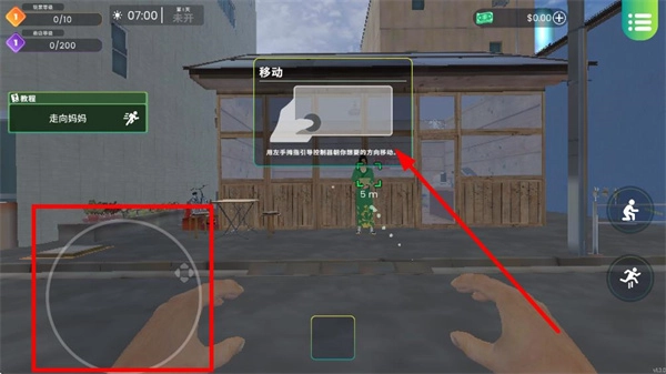进入游戏后,利用左侧的移动摇杆操控角色进行移动,从而完成基础引导环节。