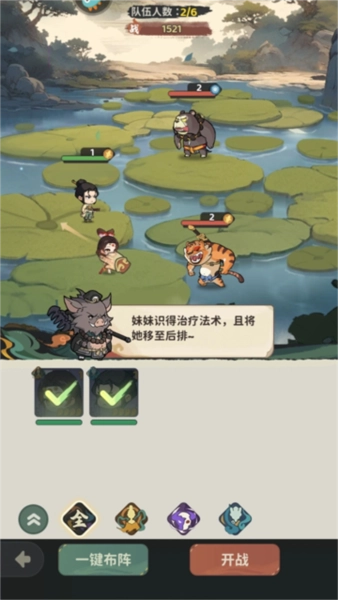 推进战斗布局,新手可采用“1坦克+1奶妈+2输出”的阵容组合(具体为老虎、狼搭配妹妹、哪吒与主角),并将妹妹布置其中。