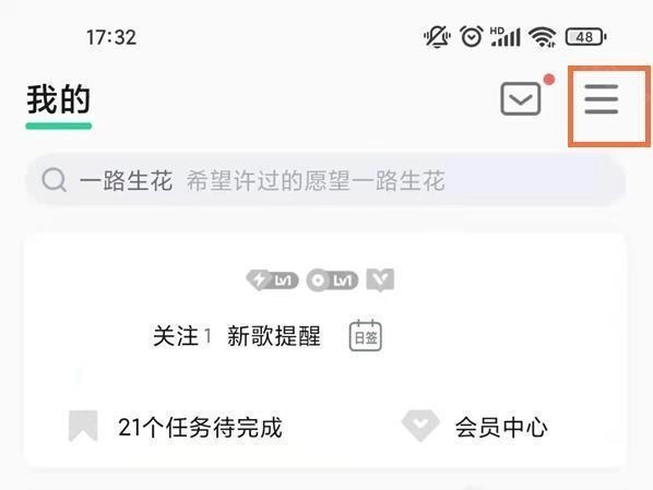 打开,在我的音乐点击右上角三横线进入更多页面。