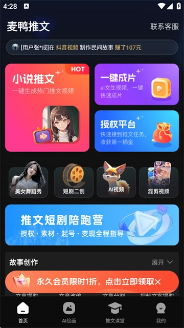 这款全能应用整合了小说推文转漫画解说、AI创作、短视频创作以及变现课堂等多项功能。