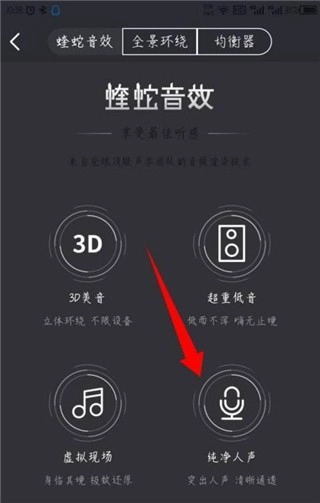 之后可以看到顶部的菜单选项,从中能够选择蝰蛇音效的全景环绕和均衡器功能。具体效果如图所示。