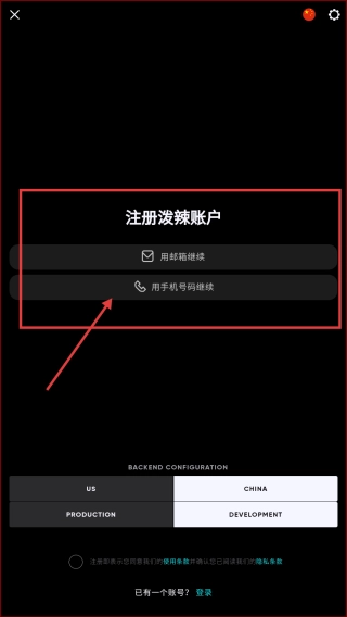 2、进入注册页面,选择用手机号码继续的方式,按提示填写信息完成泼辣账户注册流程。