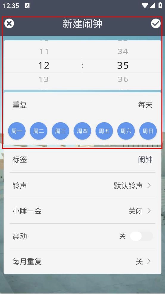 2. 在新建闹钟页面,选择时间,设置重复周期,搭配标签、铃声等,点击打钩进行保存,从而创建个性化闹钟。