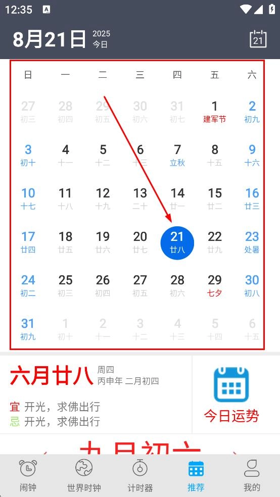 3、最后我们切换到推荐页日历,看日期,了解节气,节日,查宜忌、运势,来规划日程。