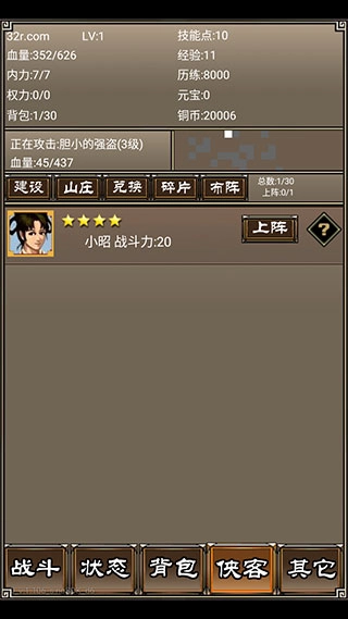 在【侠客】页面,玩家能够查看自己队伍里的侠客信息,涵盖建设、山庄、兑换、碎片与布阵等类别,便于管理和调配队伍成员。