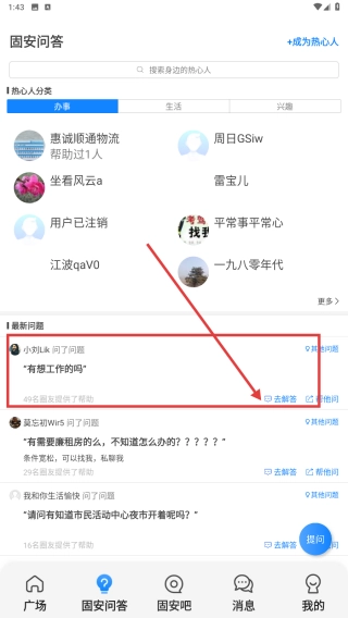 2、在固安问答页,找到有想找工作的吗问题,点击去回答,参与问题讨论、分享求职信息。